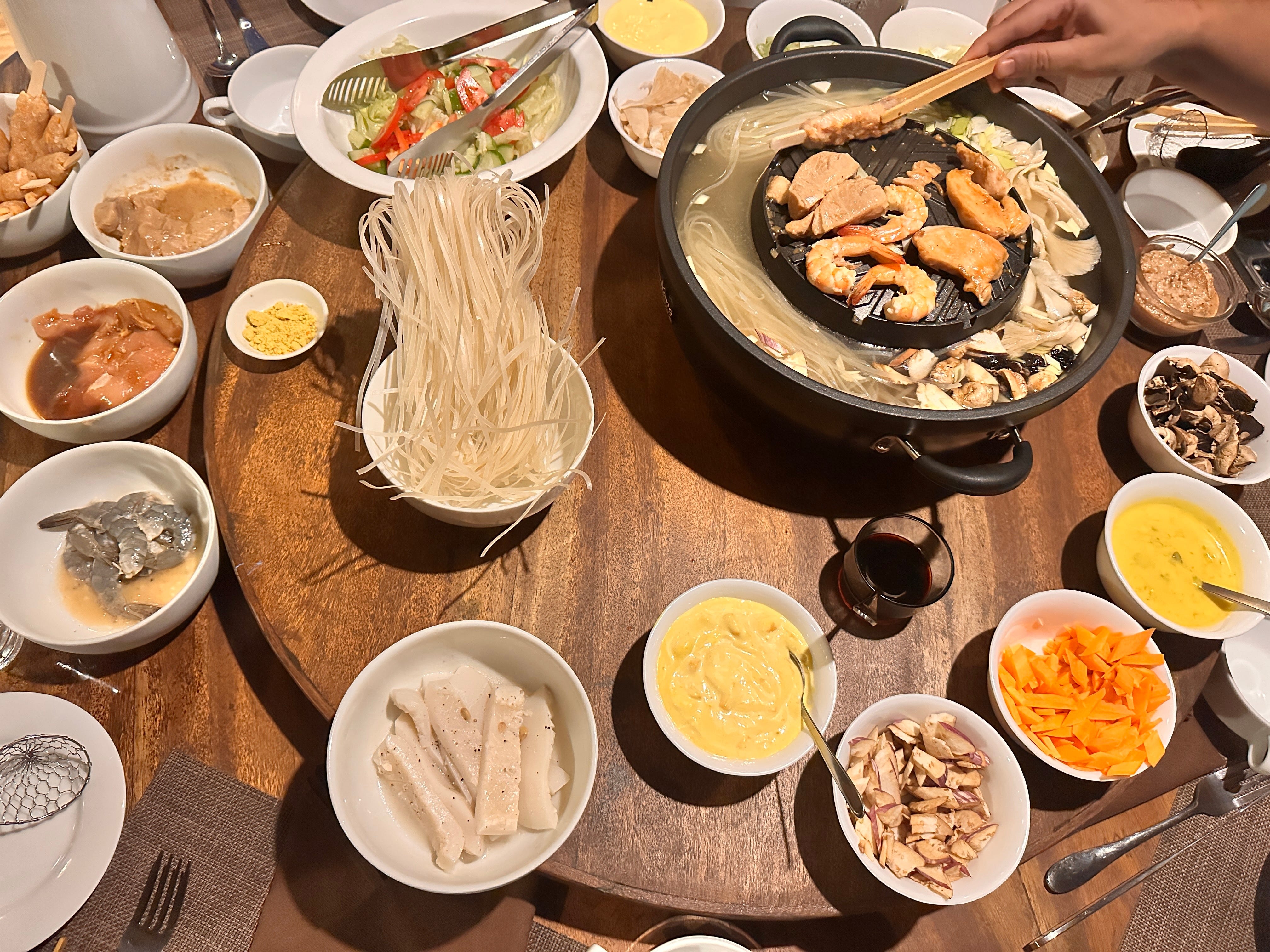 Am letzten Abend haben wir alle zusammen noch sri-lankisches Raclette gegessen. Das, was es ausmacht, ist, dass es Raclette und Fondue kombiniert: Oben ist die Racletteplatte, und im Ring befindet sich die Suppe – und der Saft des gebratenen Essens fließt in die Suppe hinein. Richtig kombiniert ergibt das ein mega Abendessen.