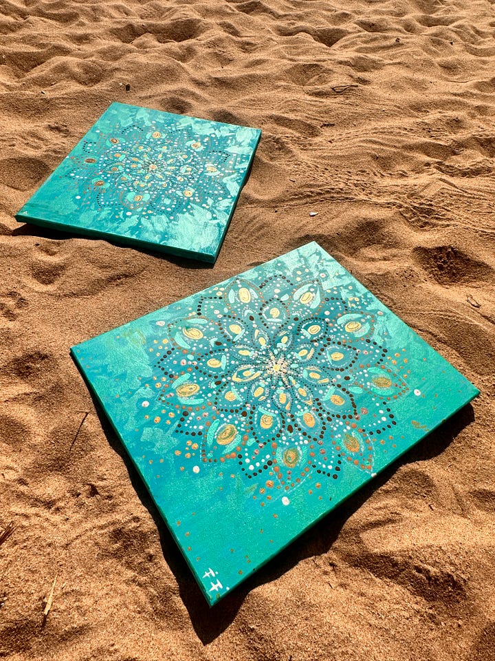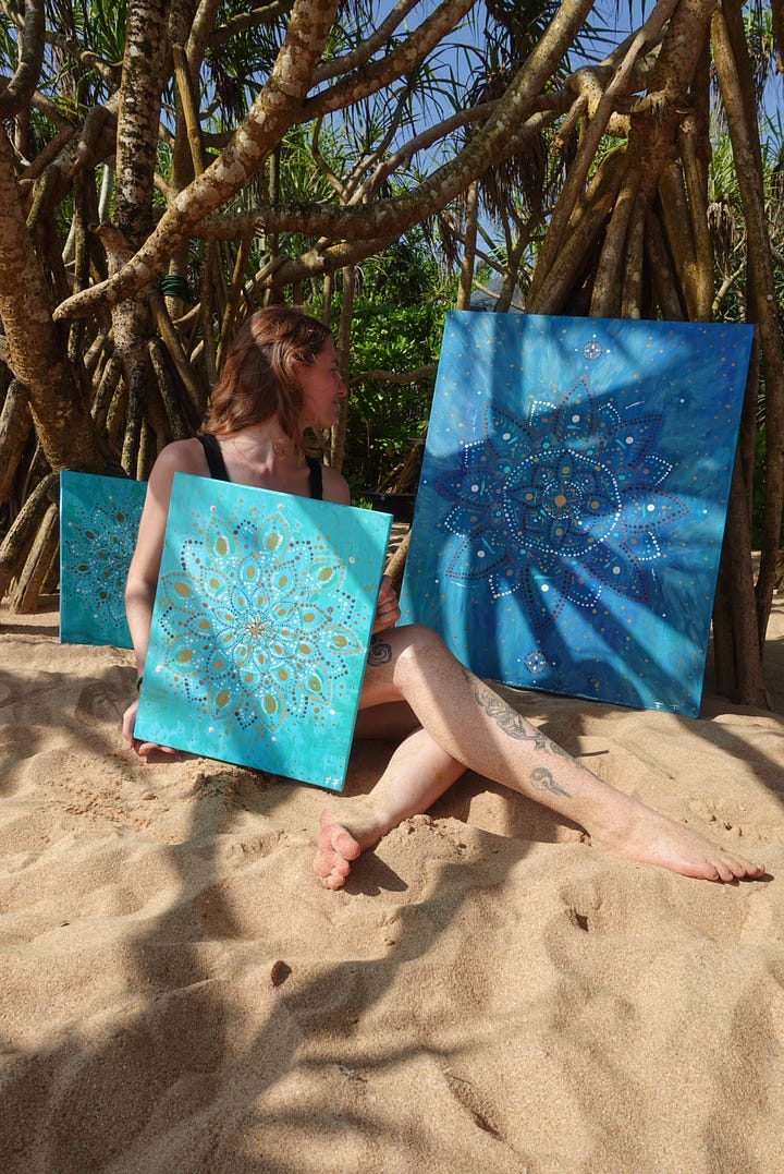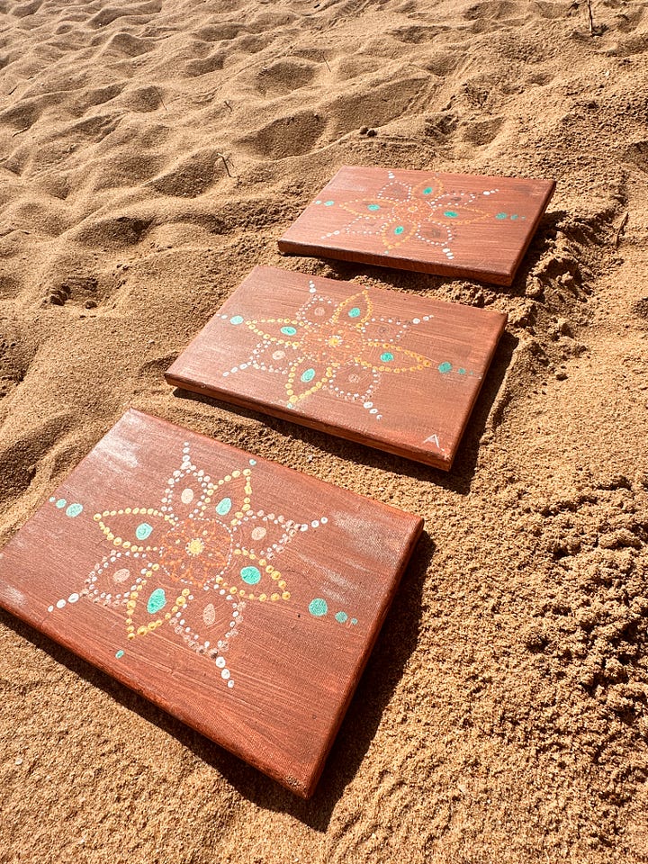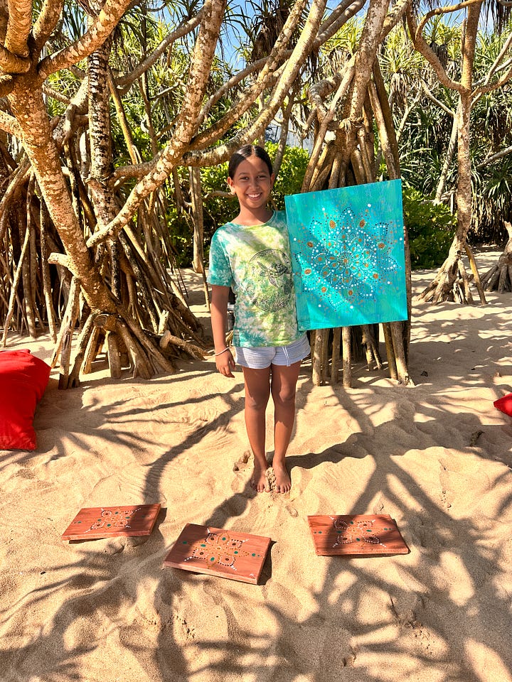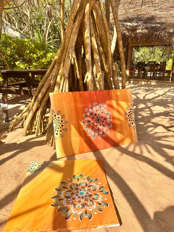 Die Arbeit hat mega Spaß gemacht, und es war das erste Mal, dass ich mich mit der Dot-Technik auseinandergesetzt habe. Ich finde, die Bilder haben eine unglaubliche Ausstrahlung, und es ist so eine schöne Erinnerung für mich, die Bilder gemeinsam mit den zwei Mädels gemalt zu haben. Ich freue mich schon unendlich, die Fotos zu bekommen, wenn die Bilder in den fertigen Suiten aufgehängt sind. Ein unvergessliches Erlebnis. 🧡✨