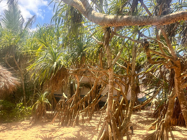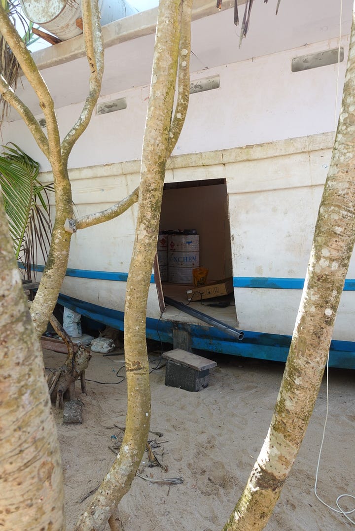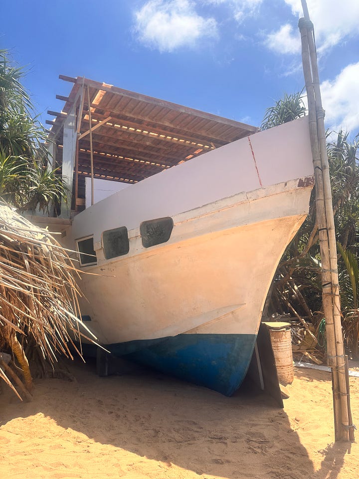 Am nächsten Morgen, nach unserem feinen srilankischen Frühstück, kamen wir mit der Hotelbesitzerin Barbara ins Gespräch – und auch mit ihrem Mann Sisirah. Sie erzählten uns von ihrem neuen Projekt: Aus einem Schiff ein wunderschönes Hotelzimmer zu bauen. Wir sahen uns mit ihnen gemeinsam die Baustelle an, und Erwin bot gleich seine Hilfe an. ⛴️✨