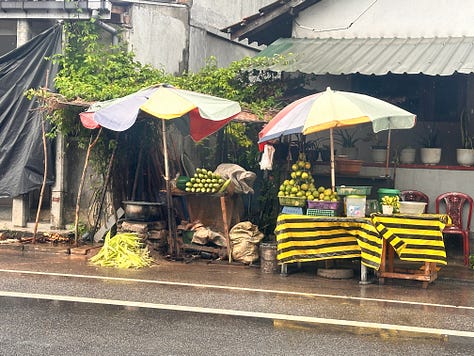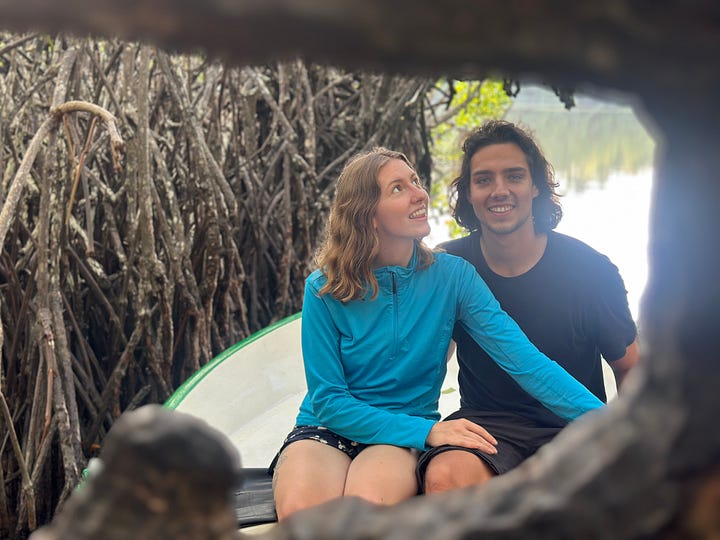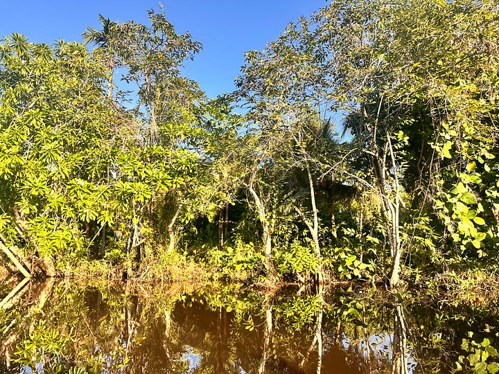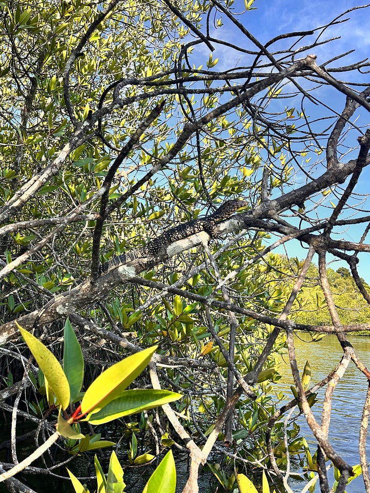 Die Pflanzen und Blumen, die dort neben diesen abgelegenen Wasserwegen wuchsen, waren atemberaubend, und wir konnten zwischen all dem frühstücken. 🌺 Auch kamen wir an riesigen Bäumen vorbei – wir blieben neben einem stehen und erschraken uns, als wir einen halben Meter von uns entfernt einen Water Monitor auf einem Ast entdeckten.