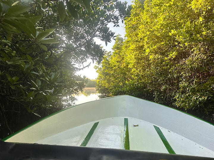 Wir fuhren entlang der Vogelinsel und unter einer Brücke hindurch – der einzige Weg von der Insel zur Stadt. Wir kamen an einem Baum vorbei, an dem hunderte Fledermäuse hingen, bevor sie sich auf Futtersuche machten. Wir fuhren dann schmale Wasserwege entlang, die manchmal den Anschein gaben, uns gleich verschlingen zu wollen – oder dass ein Krokodil aus ihnen heraus springen würde. Krokodile sahen wir jedoch an diesem Tag keine, außer das sogenannte Krokodilbrot, welches wir mit unserem Fahrer aßen. 🐊