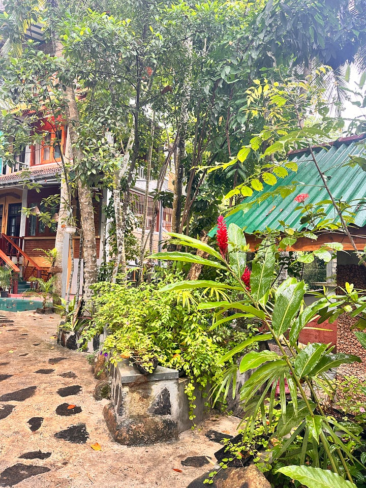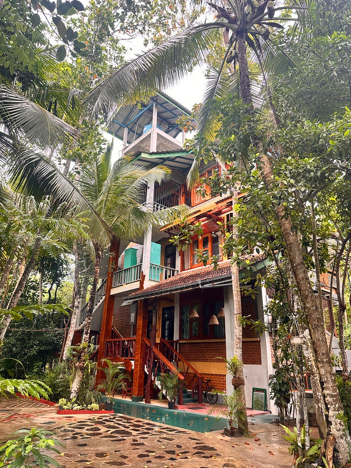 Nach circa einer Stunde kamen wir in Hikkaduwa an. Nun sind wir mitten im Dschungel, in einem kleinen Dorf, wo die Hunde mit ihrem Bellen neue Gäste bereits ankündigen. Das Gebäude unserer Unterkunft erinnerte uns an „Chihiros Reise ins Zauberland“ und obwohl es mitten im Dschungel war, ist es sehr gepflegt, denn die Mitarbeiter sind den ganzen Tag dabei, dieses Stück des Dschungels zu pflegen. 🧹🍃