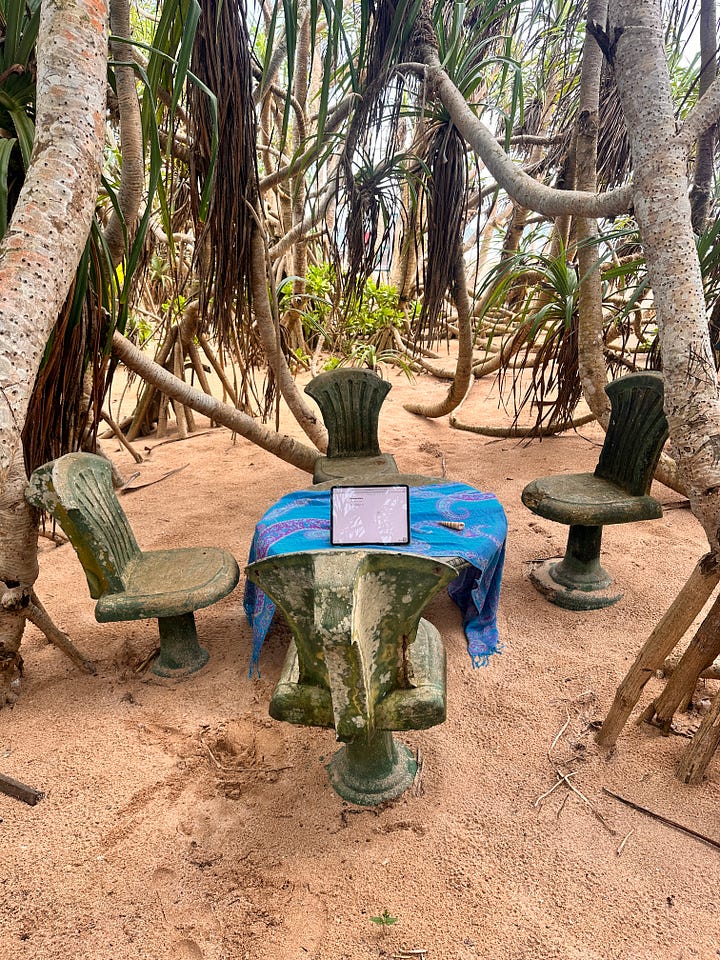 Da erinnerte ich mich daran, wie ich in Ahungalla zwischen einzigartigen Palmen lief – Palmen, die viele kleine, aus dem Boden ragende Stämme hatten, um auf Kniehöhe gemeinsam einen großen Stamm zu tragen, welcher dann die Palmenblätter und ihre Früchte trägt. Inmitten dieses Palmparadieses fand ich einen grünen Tisch mit vier gleichfarbigen Stühlen. Ich setzte mich darauf und begutachtete sie. Sie waren aus Stein gebaut und fest im Boden verankert, wunderschön verziert, und man sieht die Steinmixtur, aus der sie gegossen wurden – aufgrund der abgebröckelten Teile. Tisch sowie Stühle sehen uralt aus, und ich fragte mich, ob es sein kann, dass sie schon vor dem Tsunami dort standen und immer noch hier stehen, und somit ihre Geschichte weitertragen.