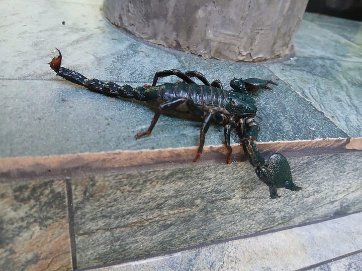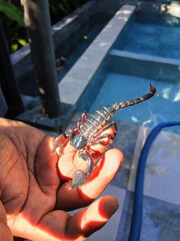 Erwin hatte noch eine spannende Begegnung mit zwei Skorpionen. Sie lagen am Boden des Pools – seit keine Ahnung wie lange – und sie fischten sie heraus. Nach ein paar Minuten begannen sie sich wieder zu bewegen; dann nahm einer der Mitarbeiter sie in die Hand und trug sie zurück in den Garten. 🦂 🌿