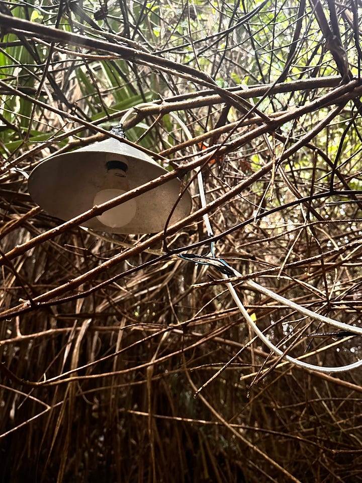 Erwin, als Elektriker, entdeckte gleich einige spannende Dinge – zum Beispiel, dass sie einfach Lampen in die Bäume hingen, die Kabel offen ließen, und der Regen vollgas drauf prasseln konnte. Oder auch die unter Strom gesetzte Säule direkt neben unserem Esstisch. ⚡️