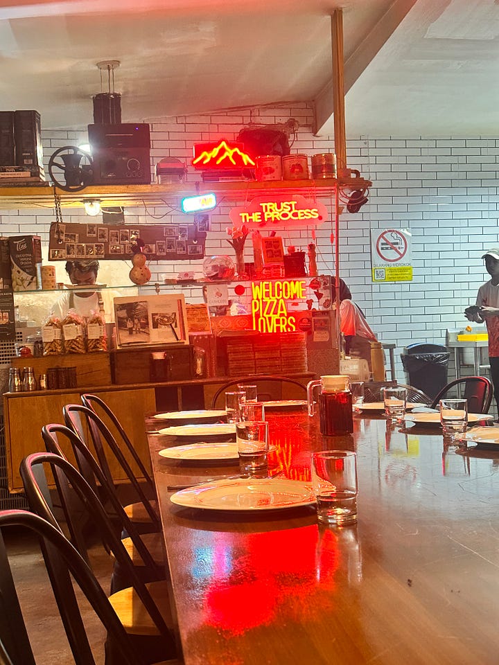 Beim Erkunden haben Erwin und ich ein kleines Restaurant entdeckt: Pizza Hills. Von außen unscheinbar, innen winzig – normalerweise kommt man nur mit Reservierung hinein. Wir hatten Glück und bekamen spontan einen Tisch neben einer Familie.