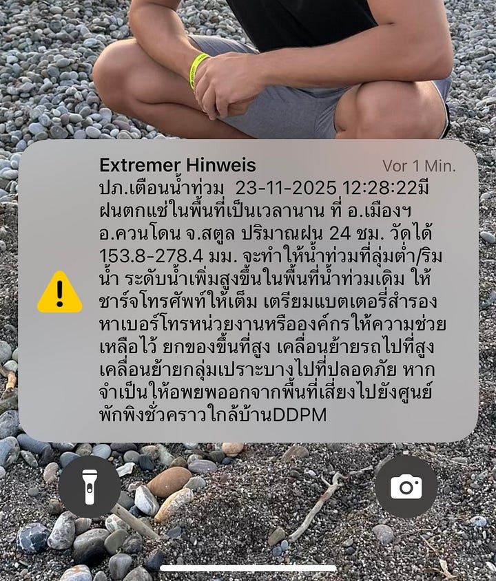 Als wir uns dann durch das süße Städtchen auf den Weg zu unserem Hotel direkt am Strand machen wollten, hörte ich einen Alarm. Ich wunderte mich, woher er kam, und als ich auf mein Handy sah, sah ich die Benachrichtigung: „extremer Hinweis“ und der Rest war in Thai. 🇹🇭