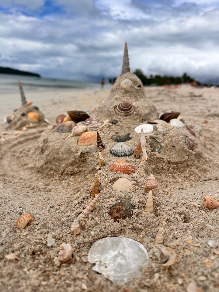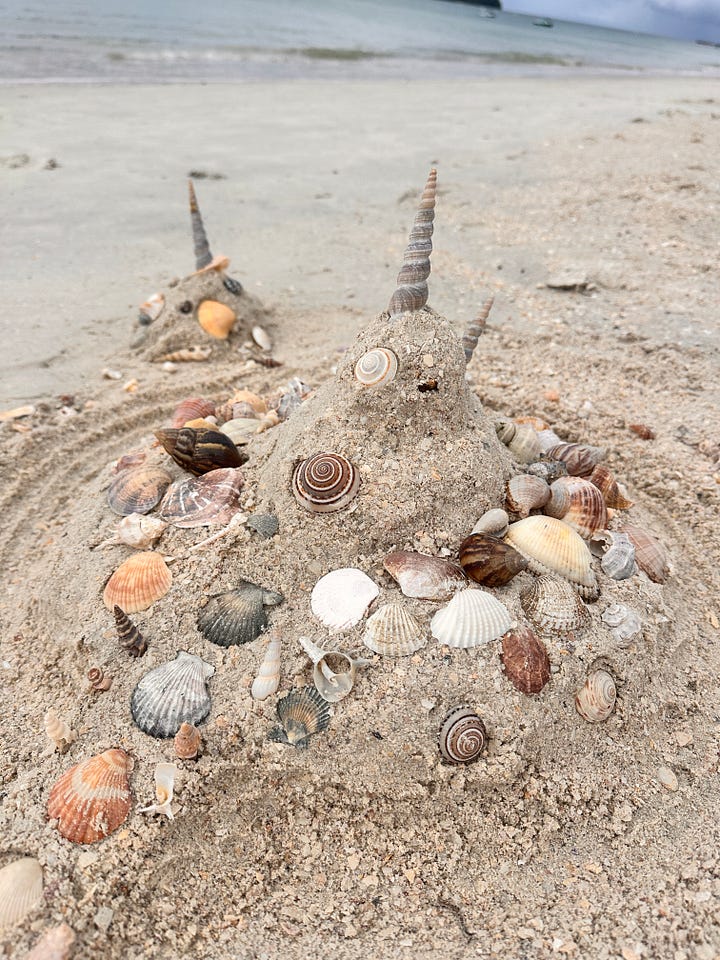 Am letzten Tag nahm ich noch alle Muscheln, die ich gesammelt hatte und hier lassen werde, und baute daraus eine Sandburg – ich finde, irgendwie sieht sie aus wie ein Alien wandelndes Schlösschen. 🐚
