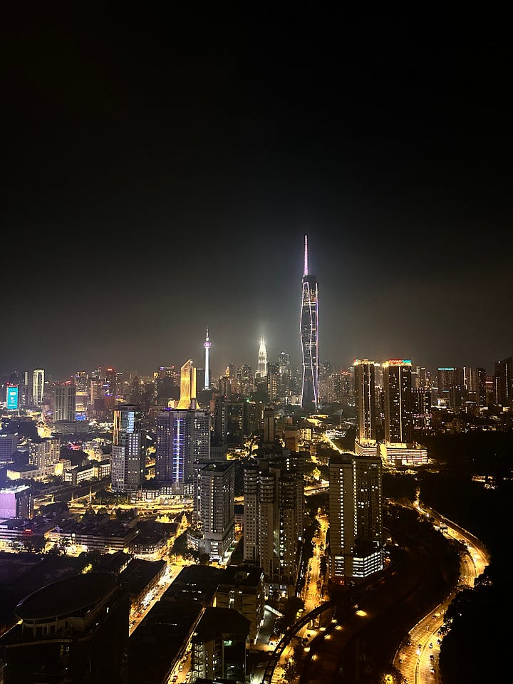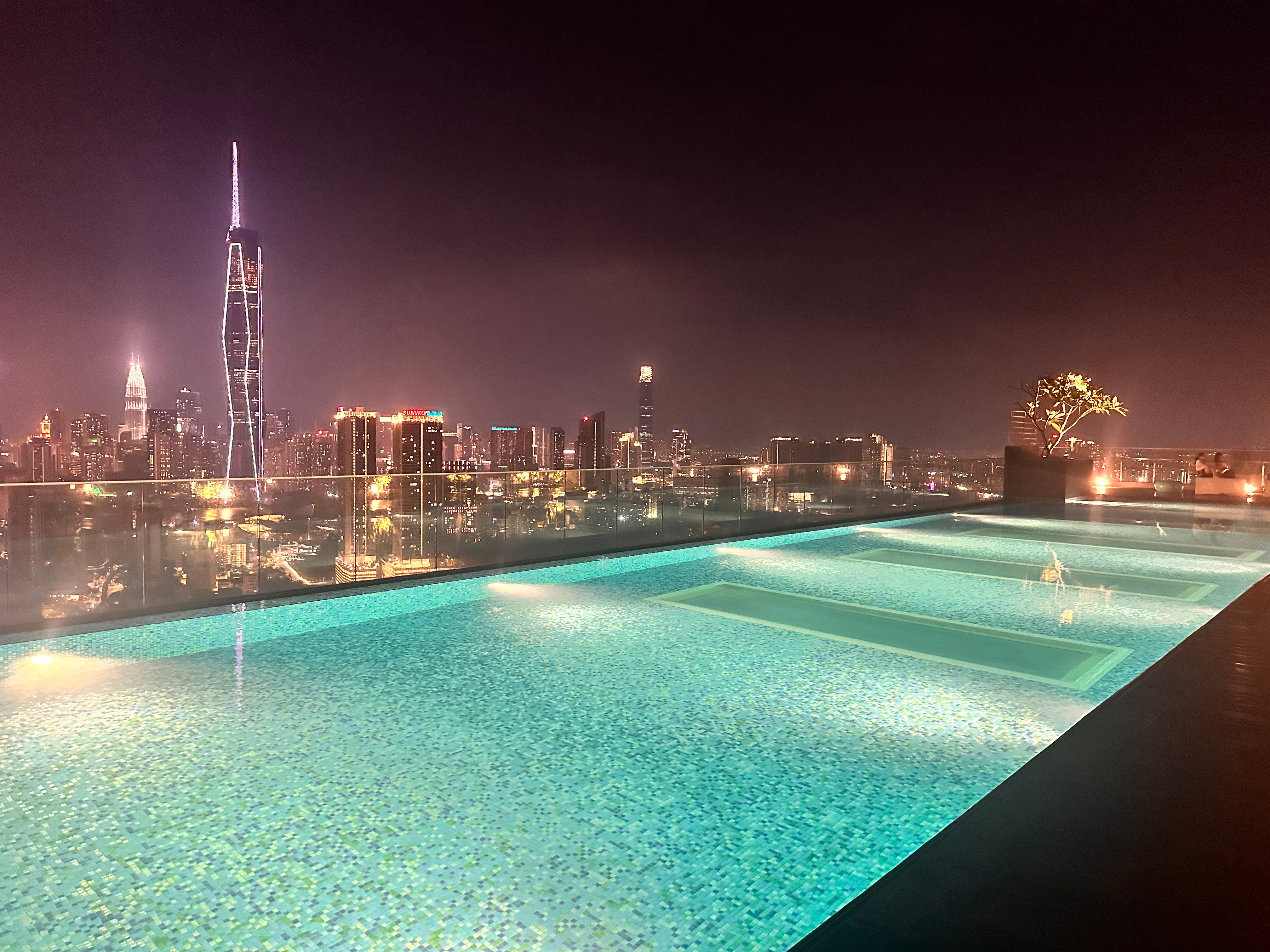 Und wir warteten meist bis zu zwanzig Minuten auf den Lift, denn das Gebäude hatte 56 Etagen – und keine Treppen. Aber das Coole: Ganz oben befanden sich ein Pool und ein Jacuzzi. Von dort oben konnte man über die ganze Stadt sehen – sogar auf das Merdeka 118, das höchste Gebäude Malaysias mit 679 Metern Höhe.
