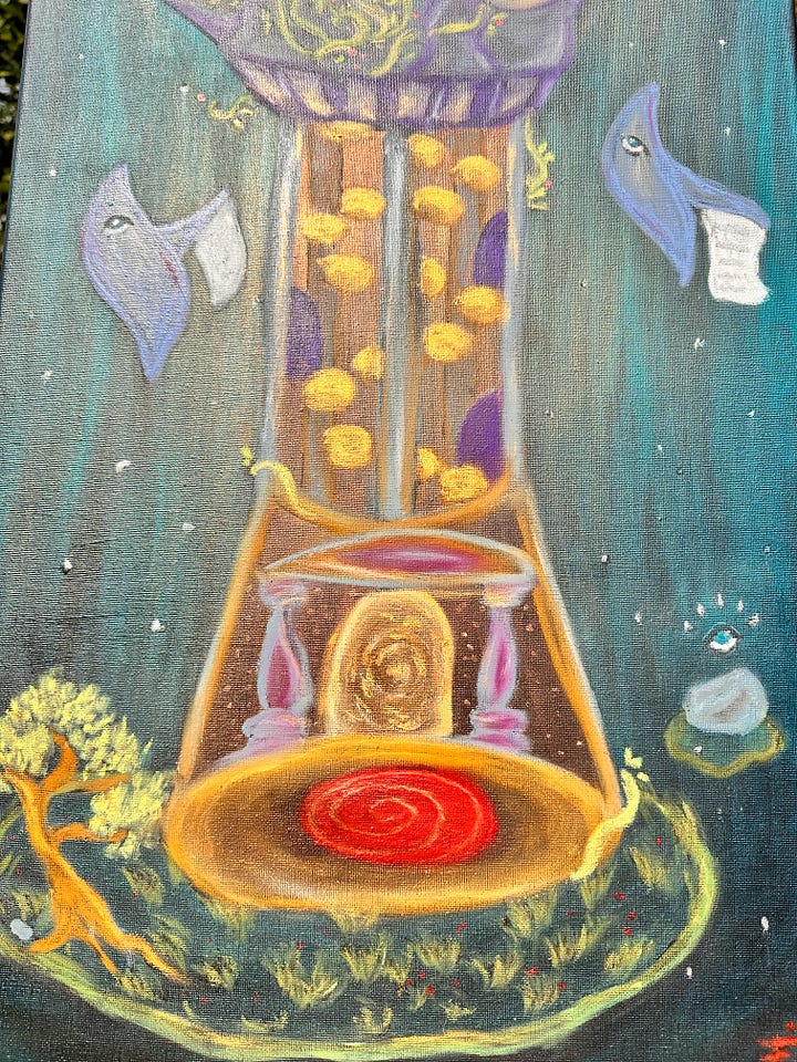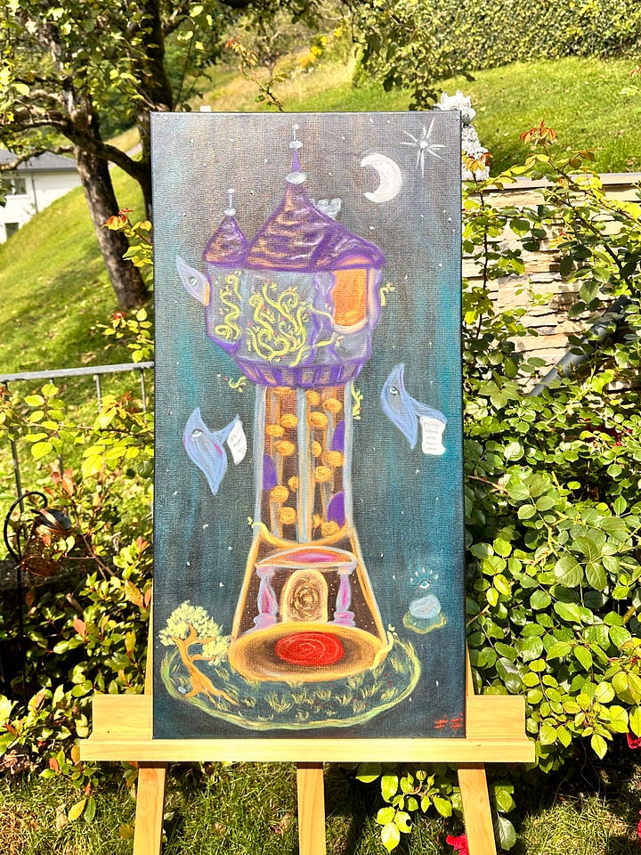 In diesem Werk ist ein Turm zu sehen, der mich sehr an Rapunzel erinnert. Für mich geht es darum, dass die Veränderung, die wir uns wünschen, in uns beginnt – keine Tür von außen kann sie für uns öffnen, nur wir selbst können diese Veränderung sein. Und im Märchen ist es der Prinz – ich glaube, das kann archetypisch für die Liebe verstanden werden, die uns im Endeffekt die Tür öffnet.