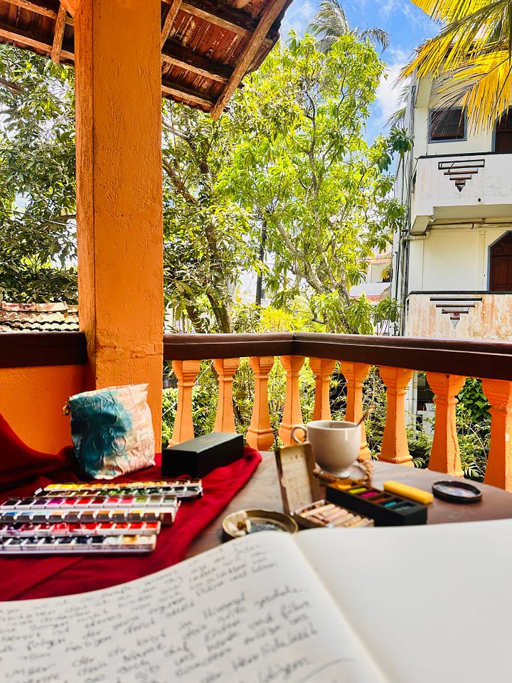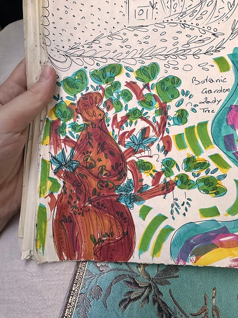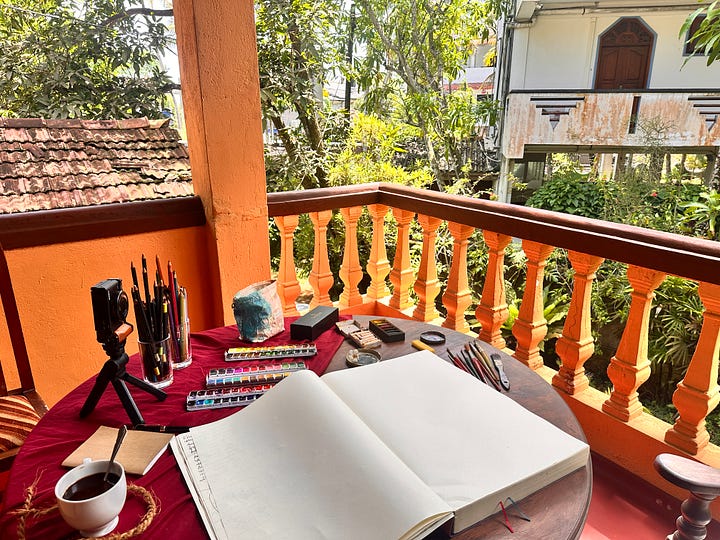 Mein großes Tagebuch, das ich so liebe, bietet gar nicht so viel Raum für kreativen Ausdruck unterwegs – es war zu groß, um es mitzunehmen. Und meine Wasserfarben waren schwer transportierbar; in der Sonne wurden sie heiß und liefen aus.